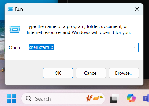 Open Run and type shell:startup to open your startup folder.