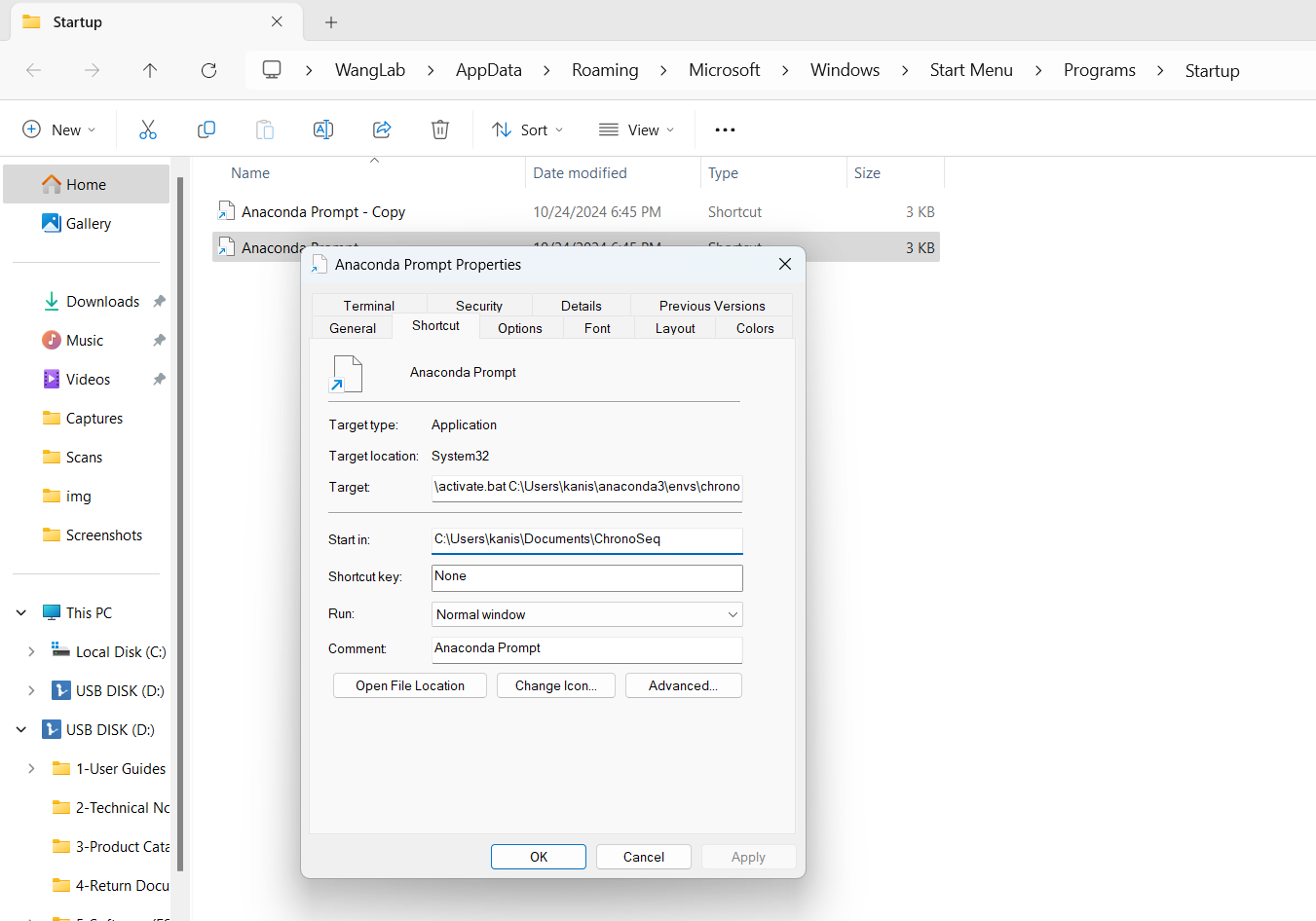 Alternatively you can modify your Anaconda Prompt shortcut so that it always activates the Chrono Environment and launches at the location of your Git repository. I've included an example here.