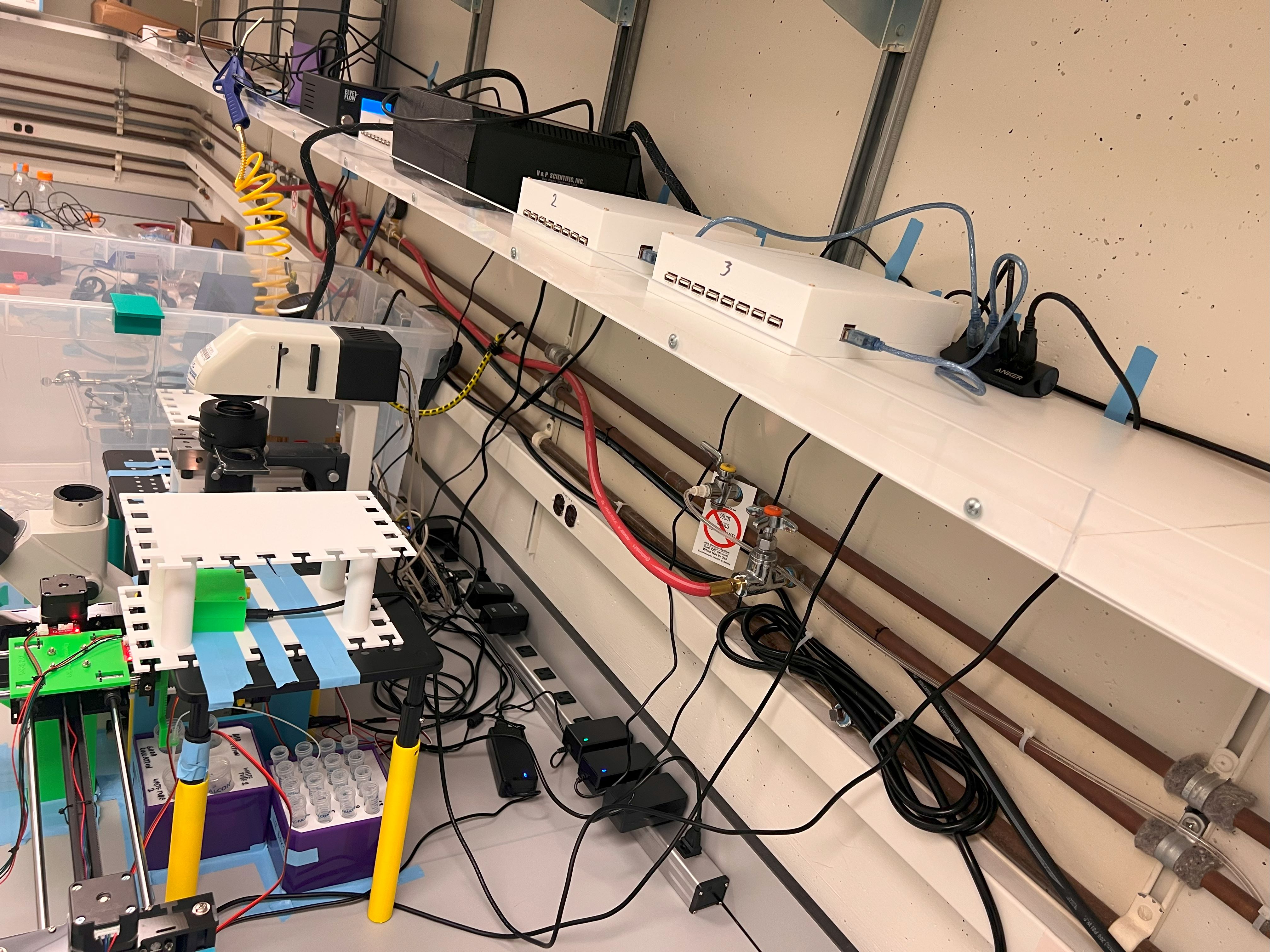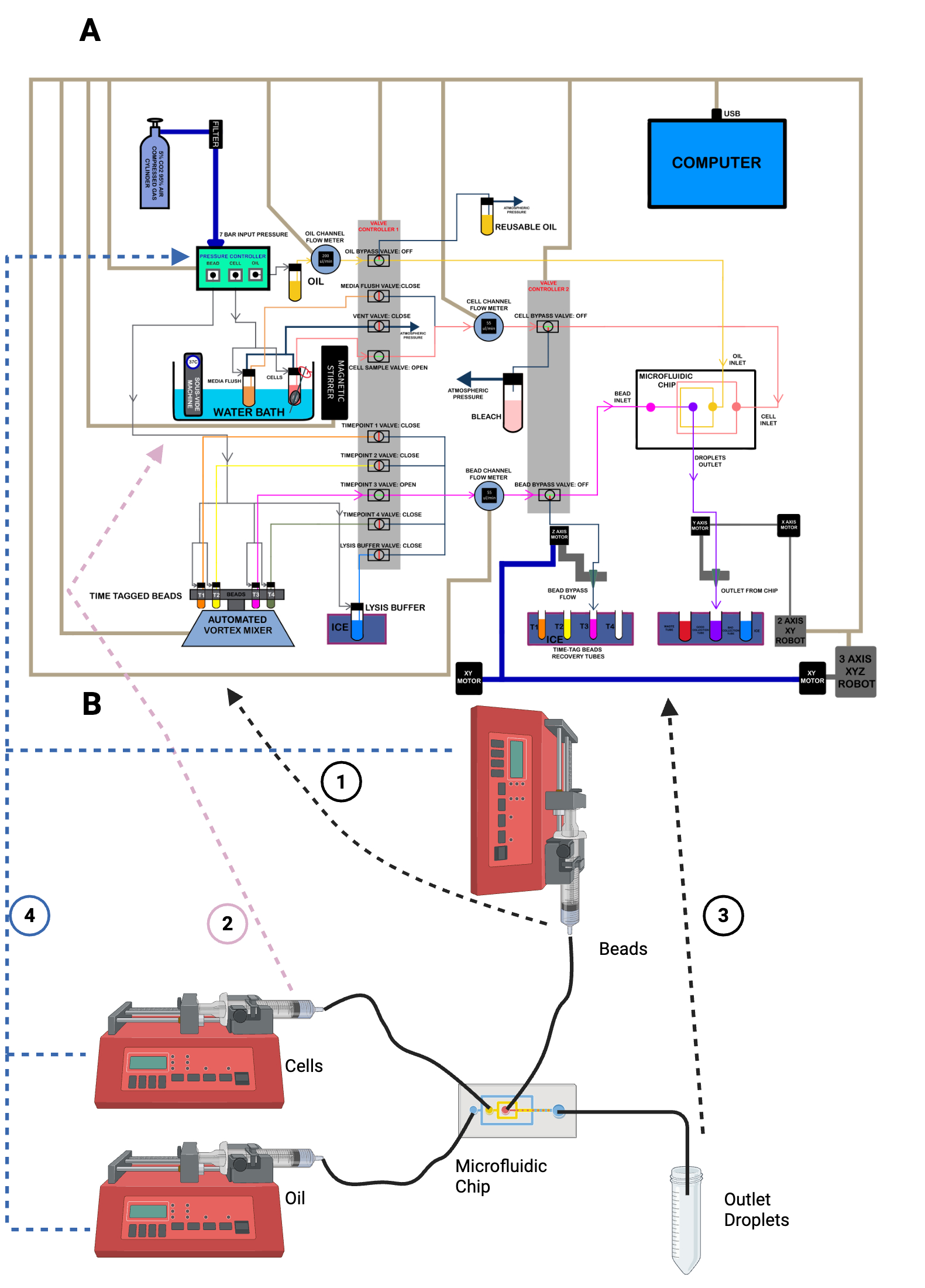 The ChronoSeq device is controlled via serial connections to a computer, which coordinates the actions of its various components, while the Dropseq device works by setting flow rates manually on syringe pumps. Some key features distinguish the ChronoSeq device: