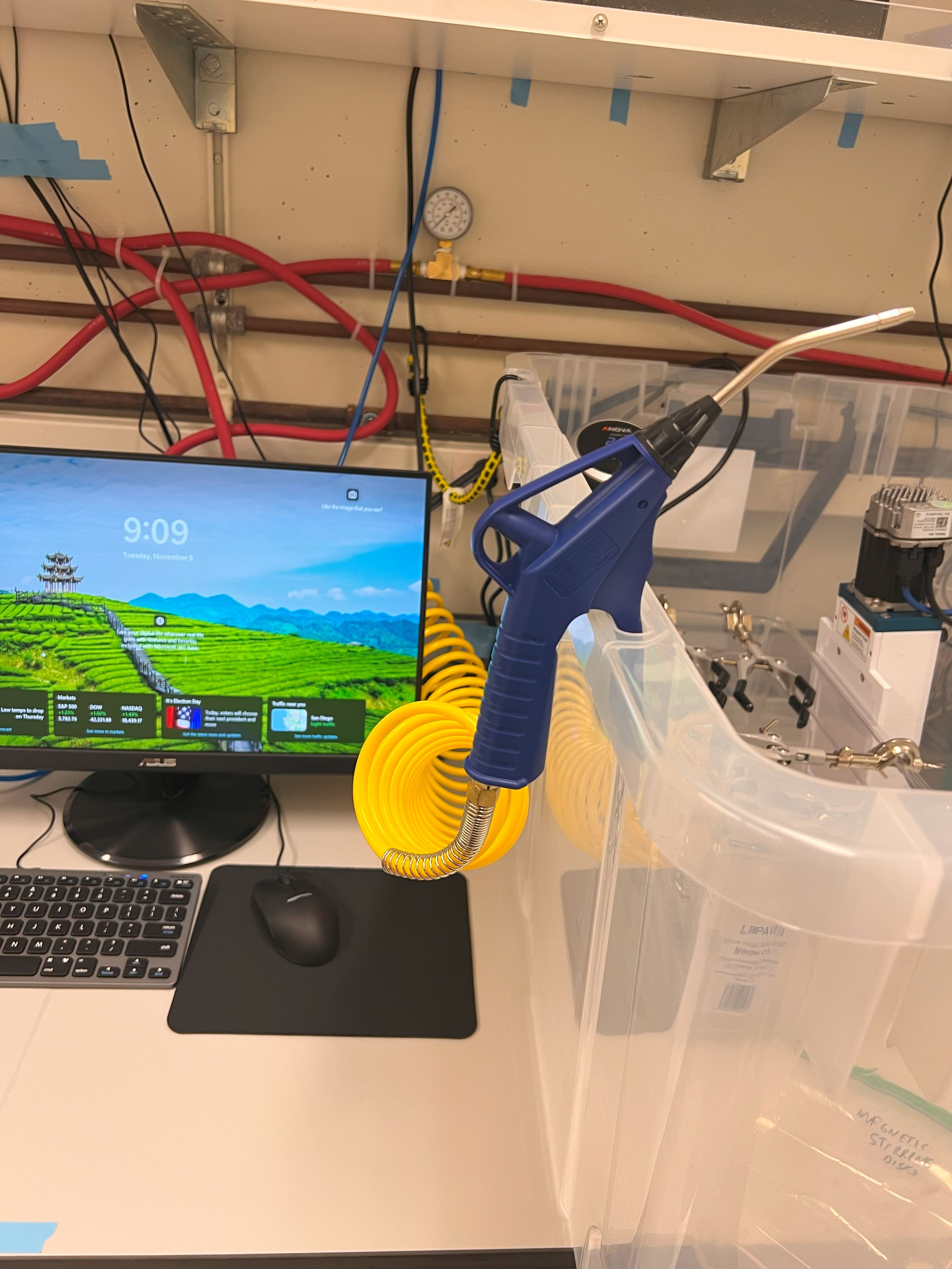 WARNING: Make sure you wear safety glasses. Comressed Air can be dangerous. Please follow the Hazard Control Plans for your lab and institution.