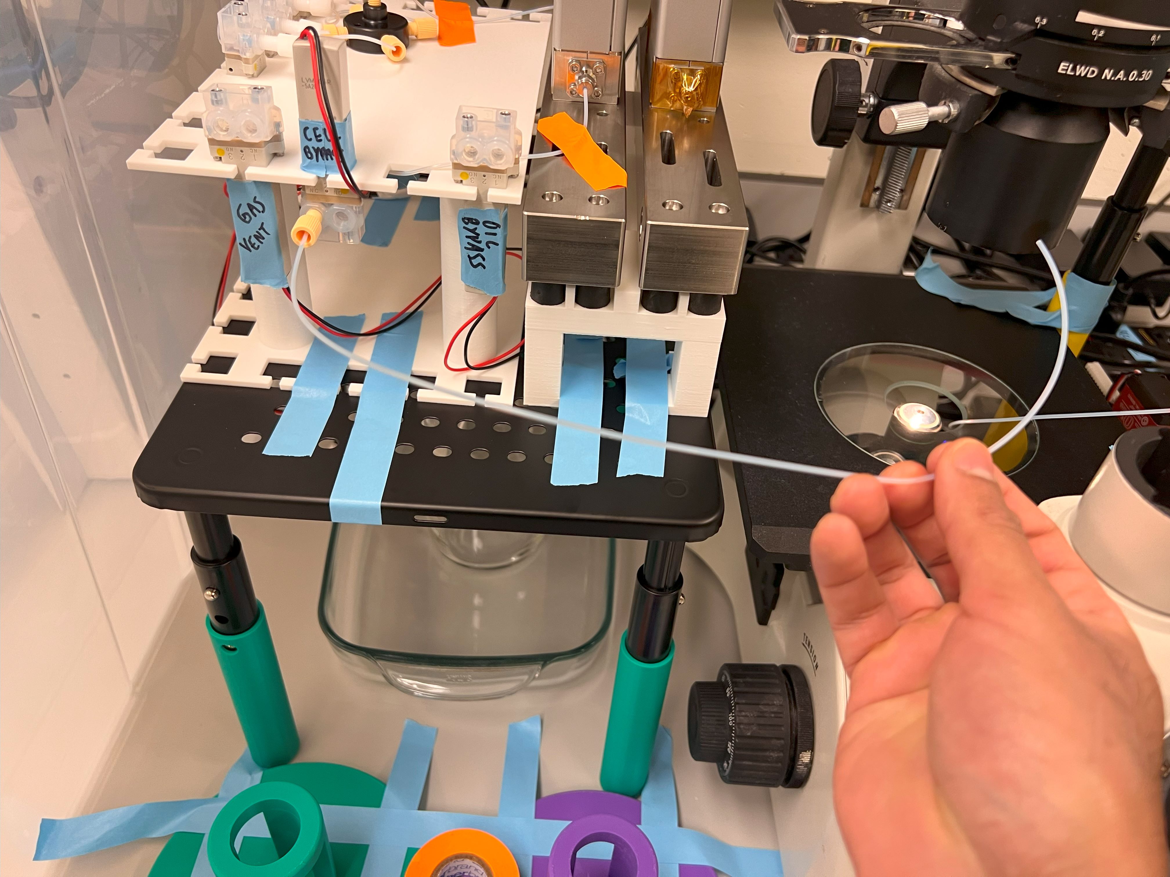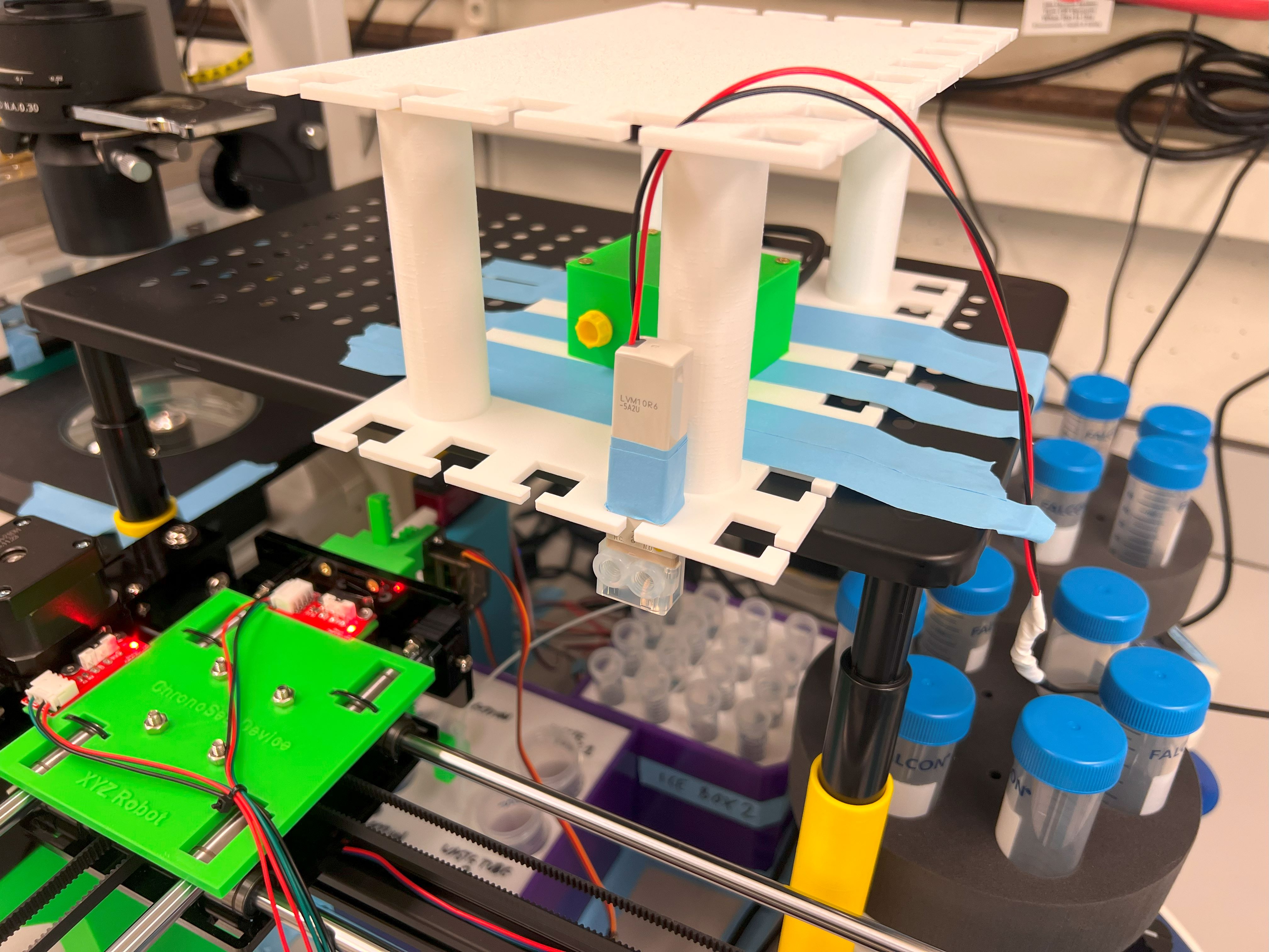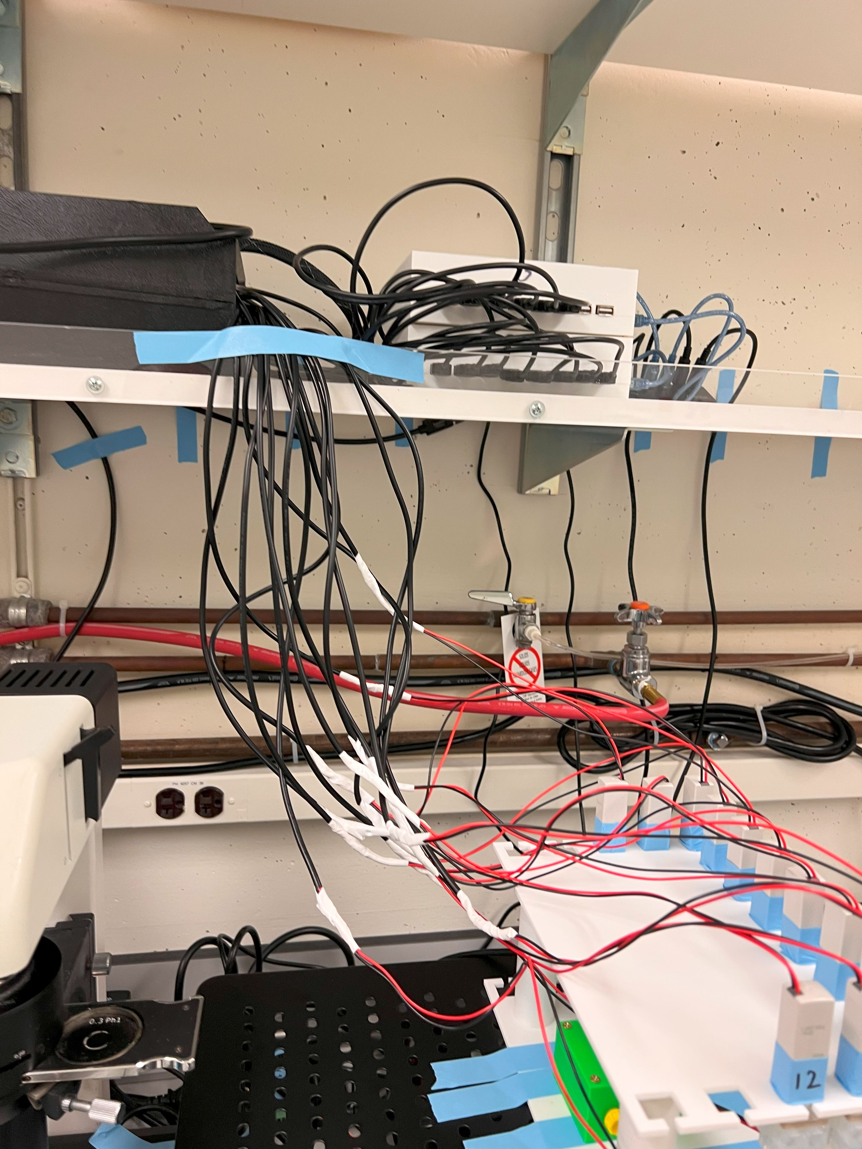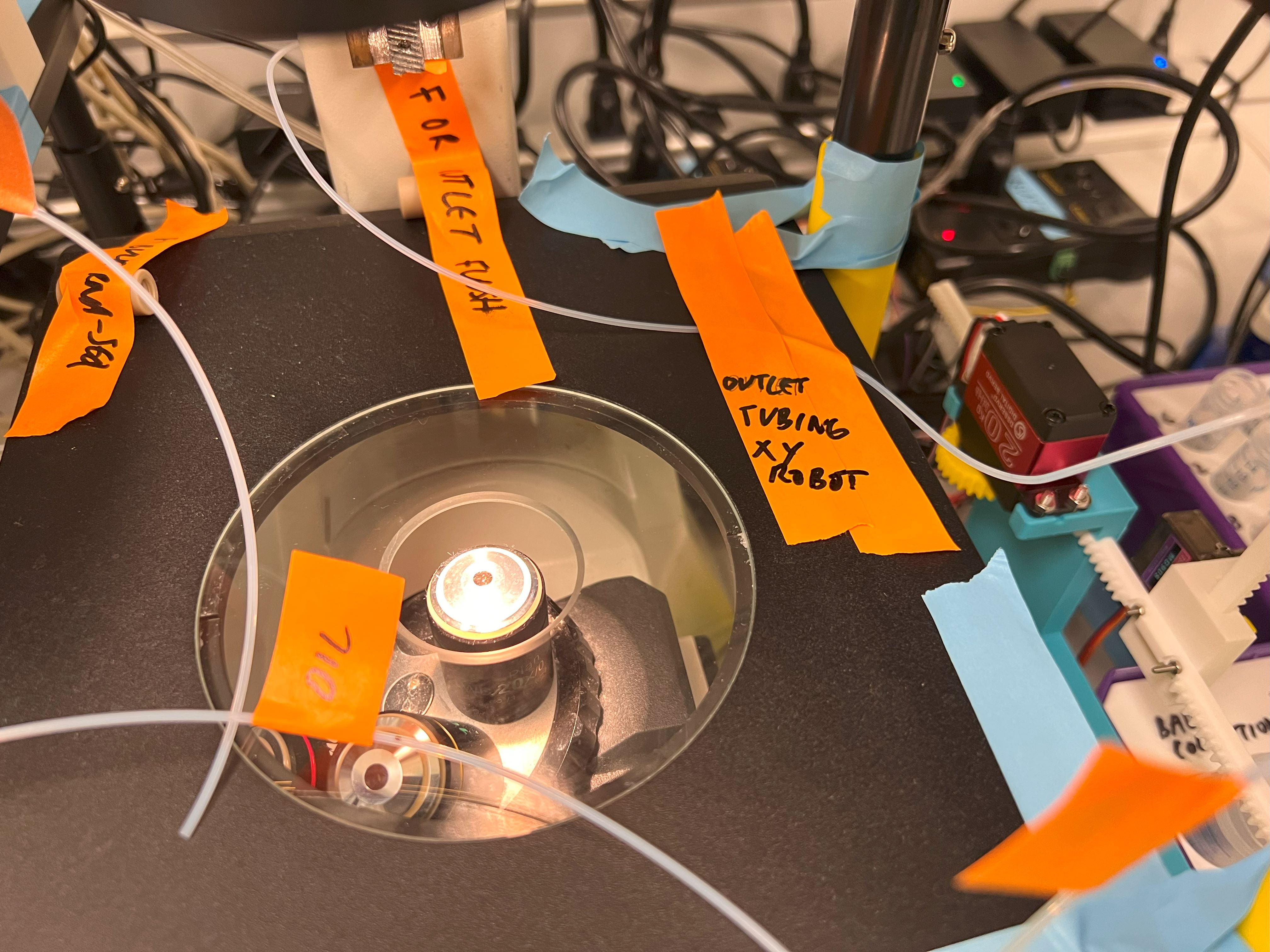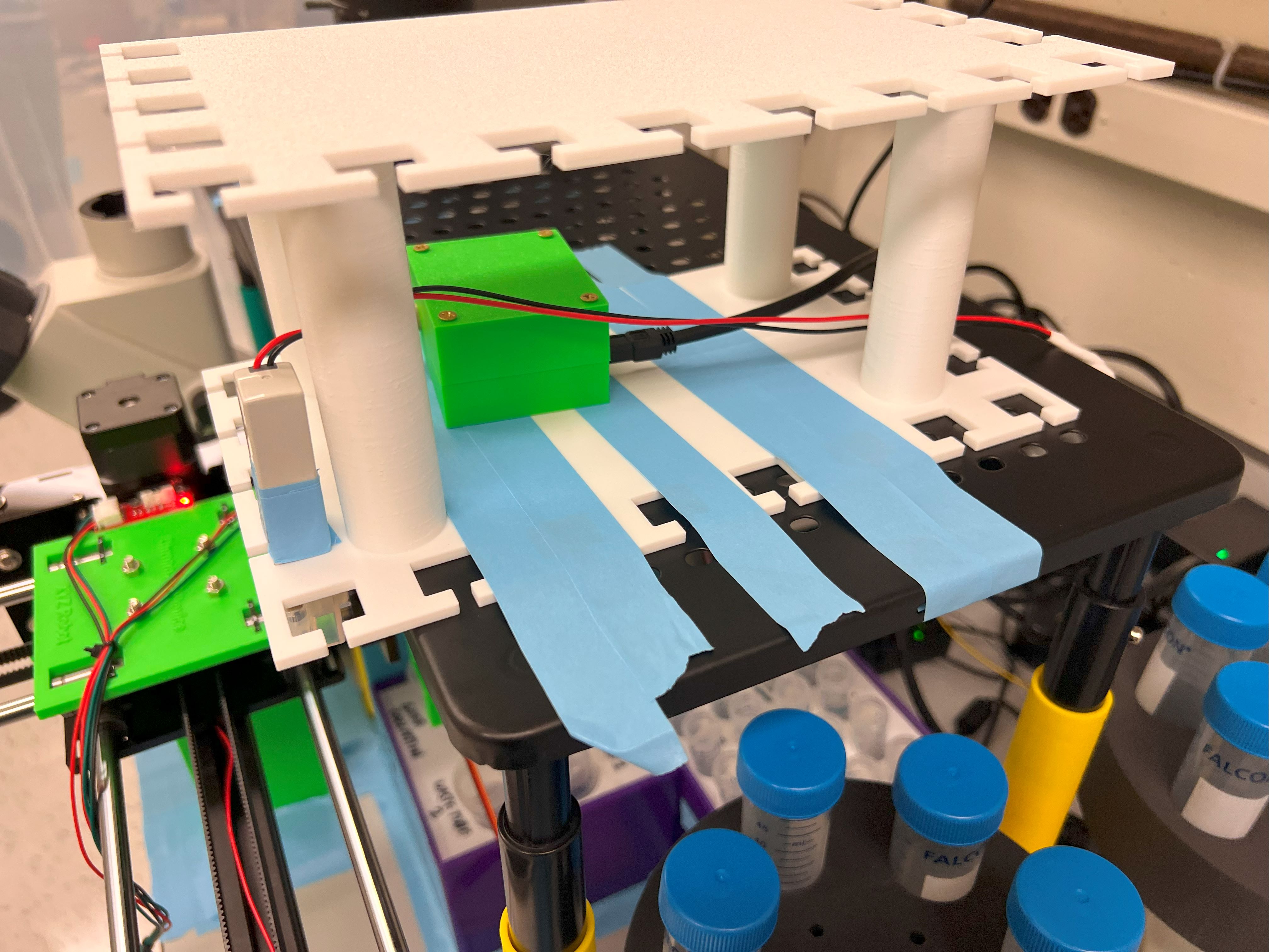 Attach to Linear Rail on XY Robot. Leave enough slack. | Tape to Microscope stage. |
