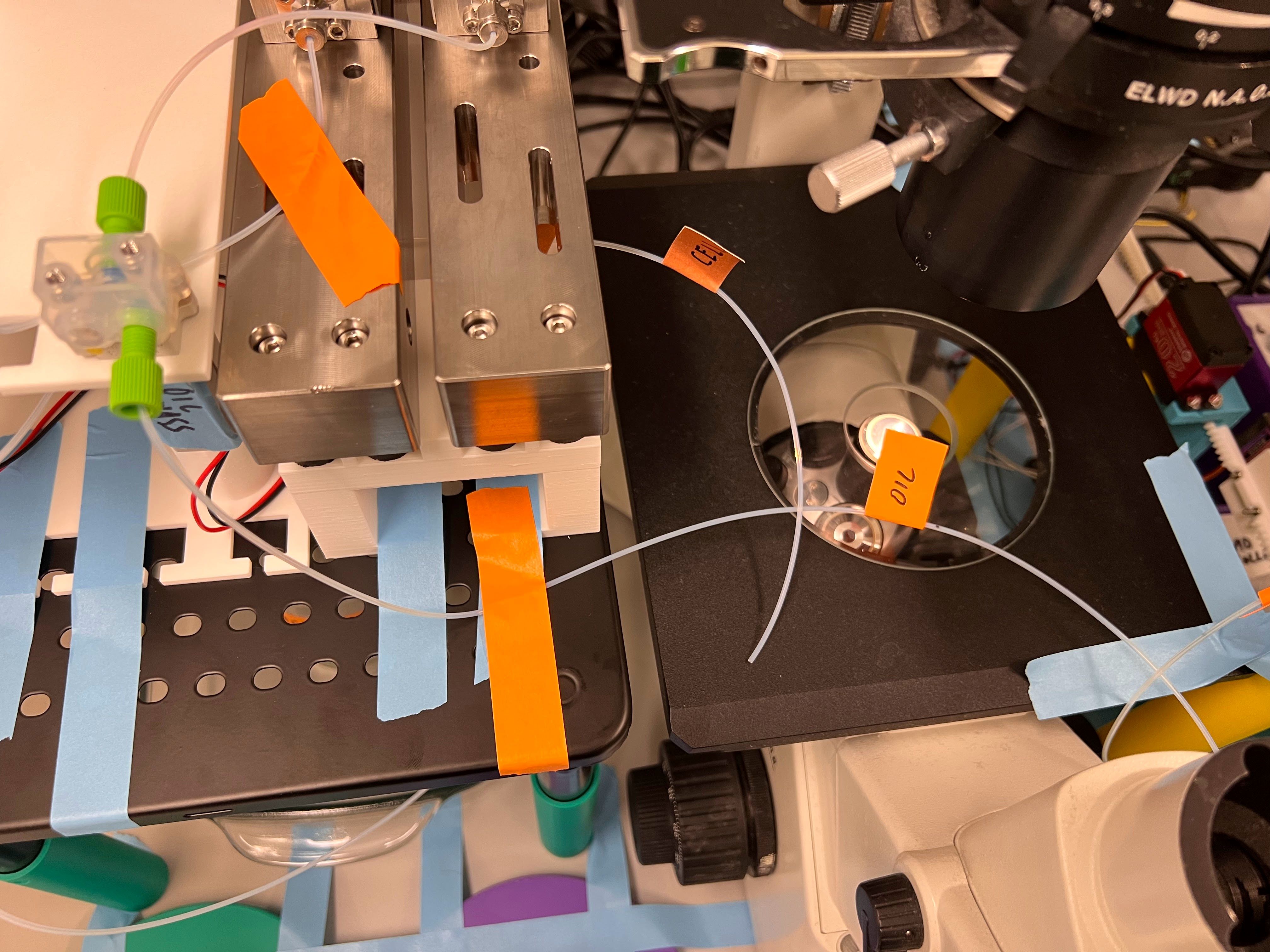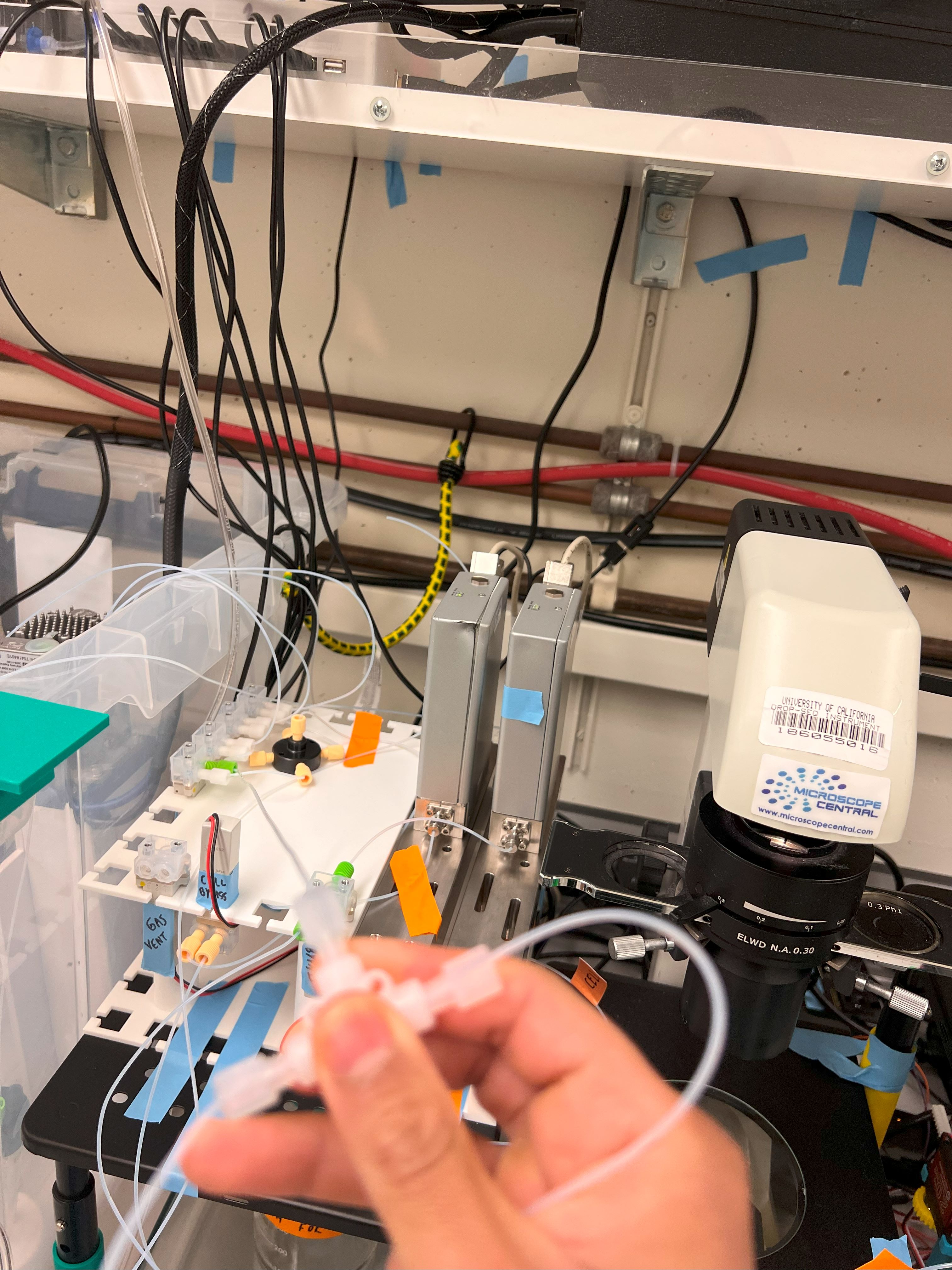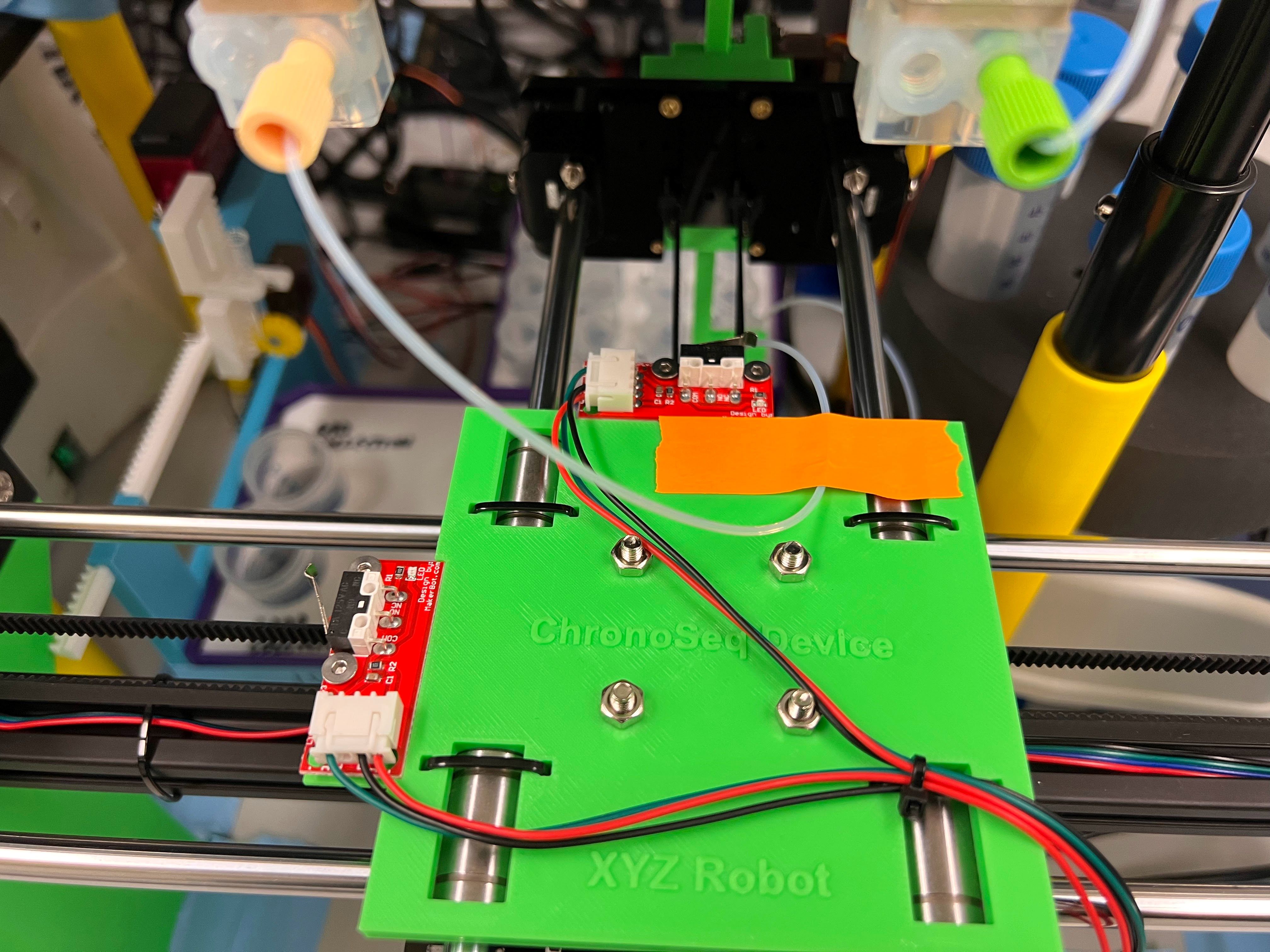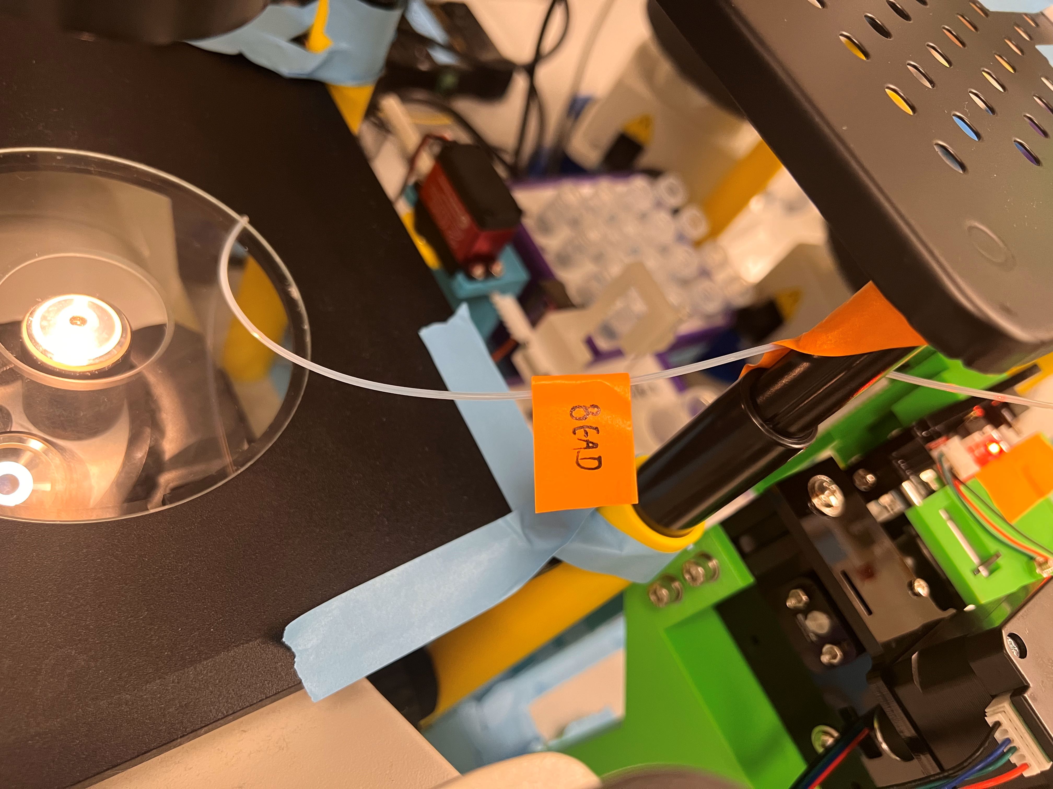 Attach to Linear Rail on XY Robot. Leave enough slack. | Tape to Microscope stage. |
