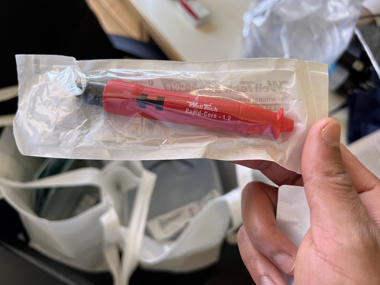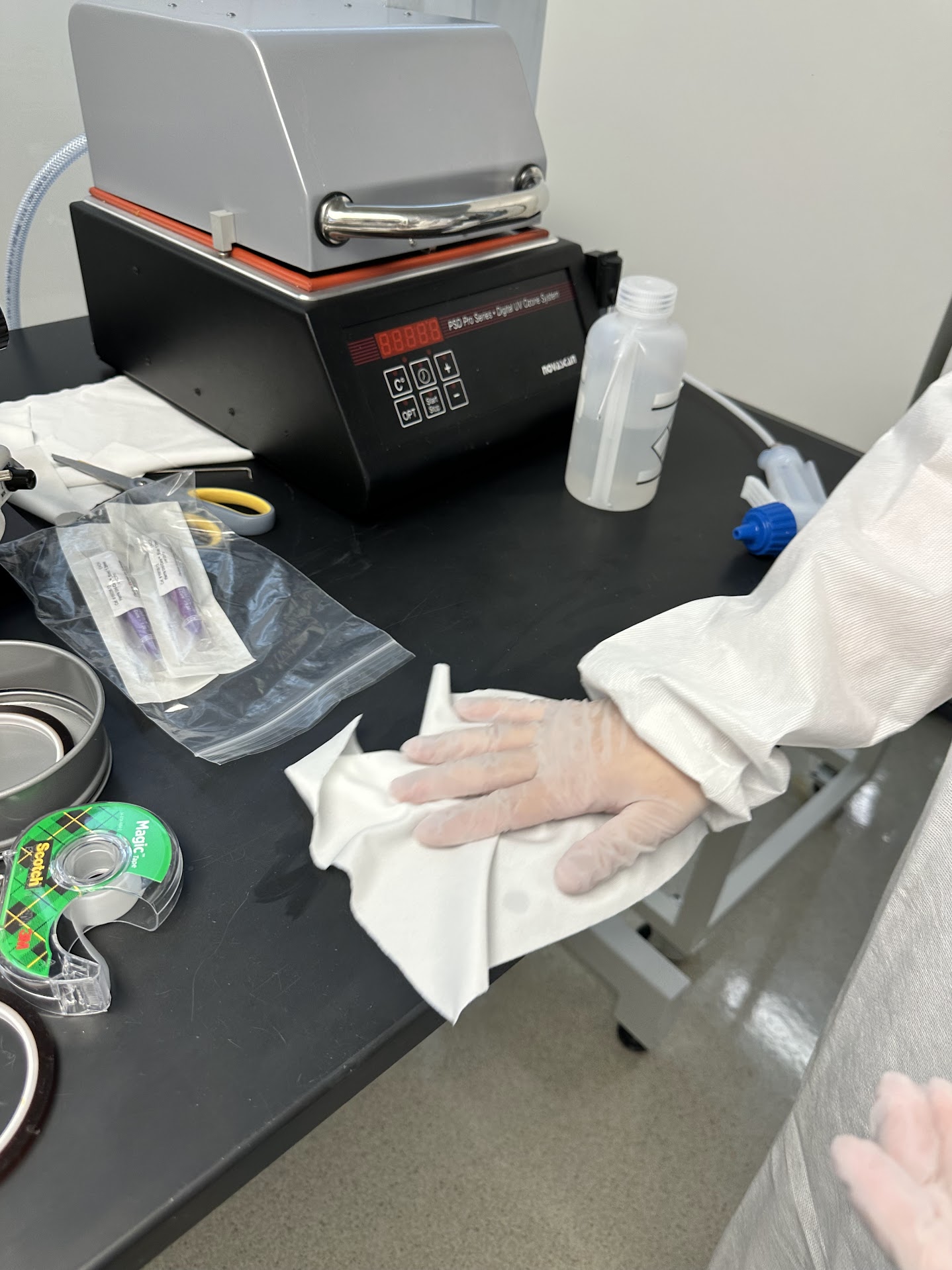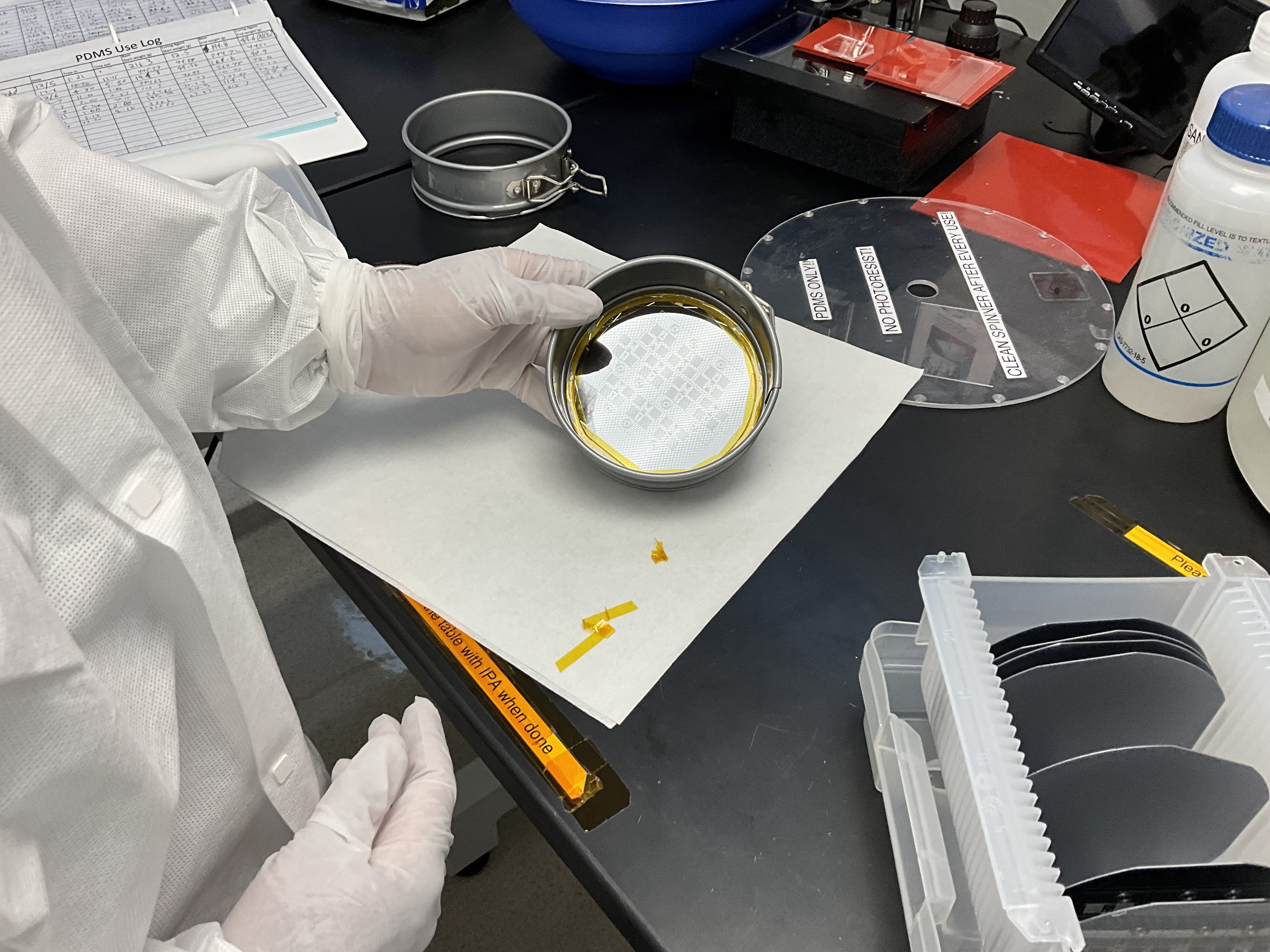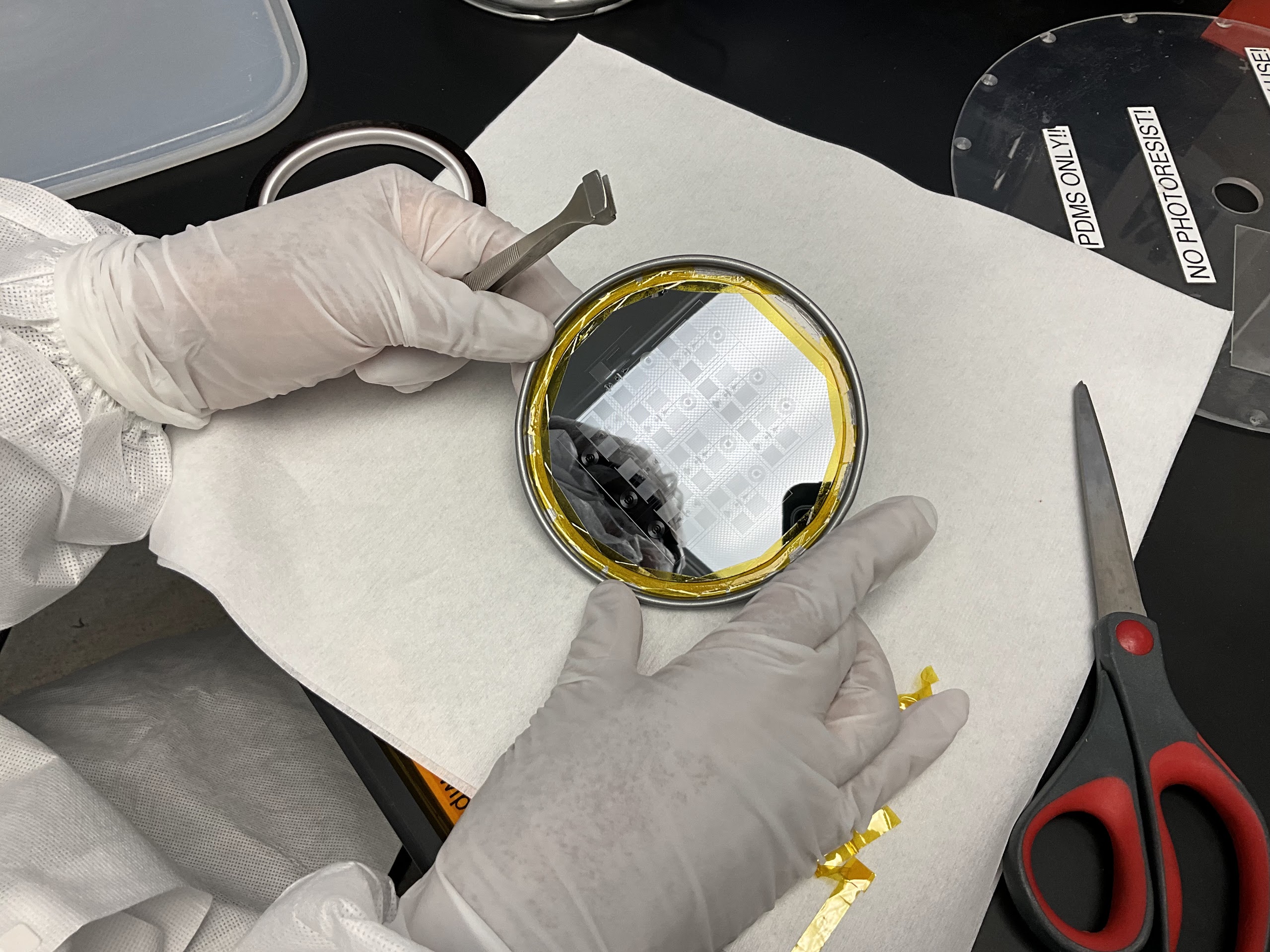 By now you should have punched holes, cleaned and covered all the chips with scotch tape. Now label the petri dish with the date of production for the chips, your name and the Version number for the Microfluidic Chips.