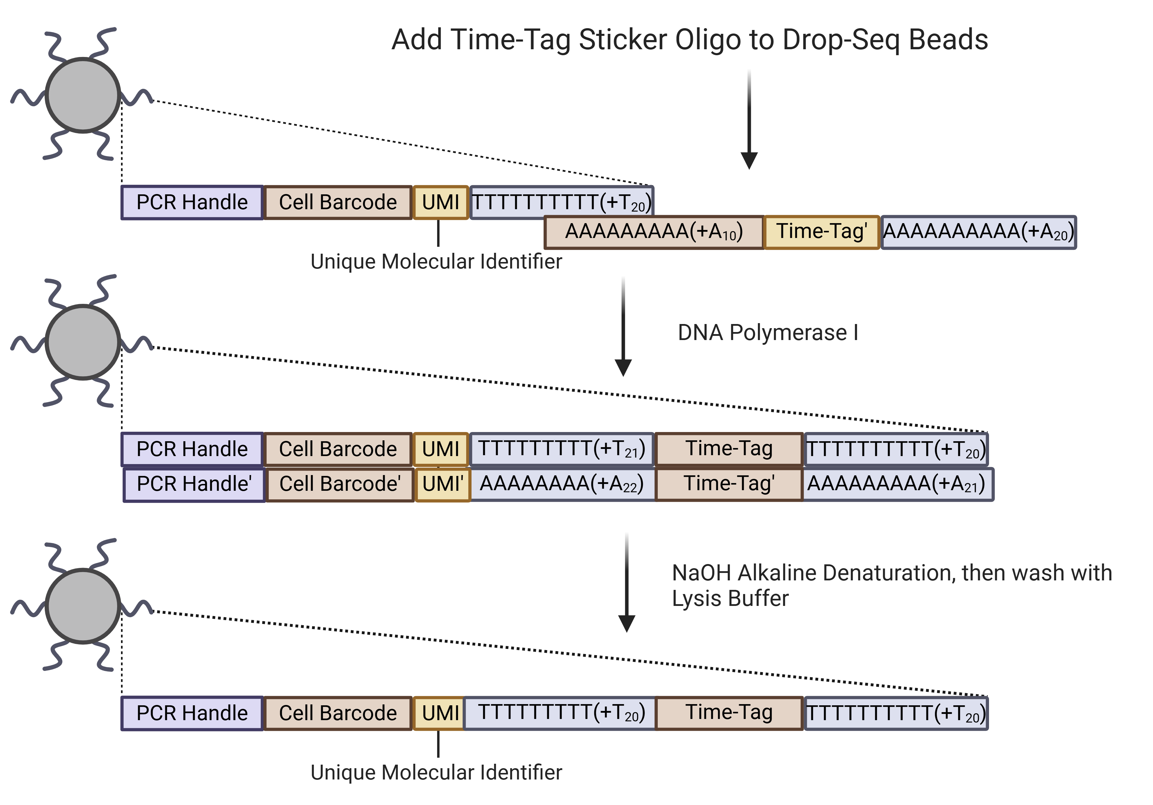 Sequences are added by using an oligo that binds to the existing PolyT region on Drop-seq beads. The 3’ end of the Drop-seq beads are then extended to the reverse compliment of the oligo using E. Coli DNA Polymerase I. Alkaline denaturation is used to make the double stranded DNA single-stranded. These beads are then resuspended in lysis buffer and can be used directly with our device.